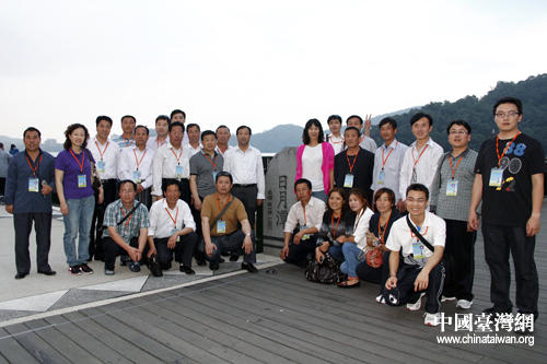大陸基層農(nóng)民代表參訪團(tuán)游覽日月潭風(fēng)景區(qū)并合影留念。(中國臺灣網(wǎng) 于斯文 攝)
