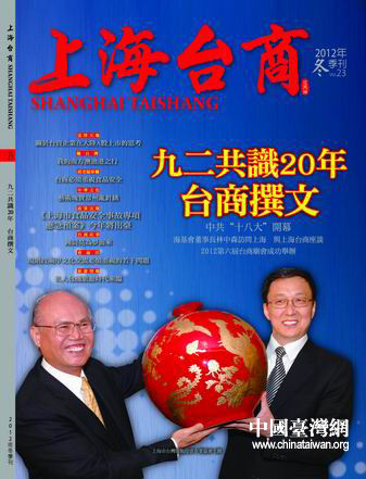 中國臺灣網11月14日上海消息 “九二共識”達成二十周年之際,上海臺商紛紛在新出版的2012年冬季刊《上海臺商》雜志上撰文,表示“九二共識”是兩岸經濟共創雙贏的重要保障,應珍惜“九二共識”的成果,繼續深化和發展“九二共識”精神。