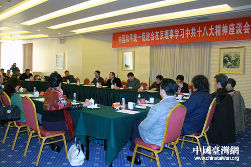 中國臺灣網11月23日北京消息 23日下午,中國和平統一促進會在北京友誼賓館召開在京理事學習中共十八大精神座談會,來自黨政部門、新聞媒體、科教、經濟、文化藝術等界別的25位理事出席座談會。