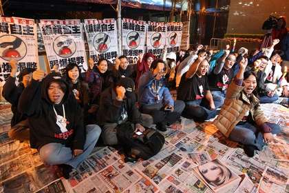 交易前夕,員工冒低溫細雨夜宿抗議。圖片來源:臺灣媒體