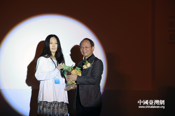 清華大學大四女生武超獲得金獎,圖為法藍瓷有限公司總裁陳立恒為其頒獎(中國臺灣網 李徽 攝)