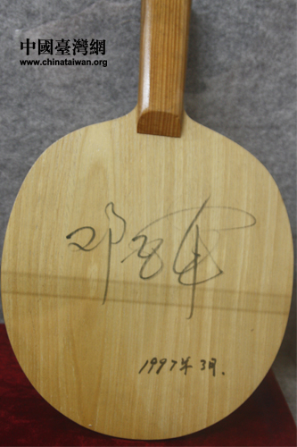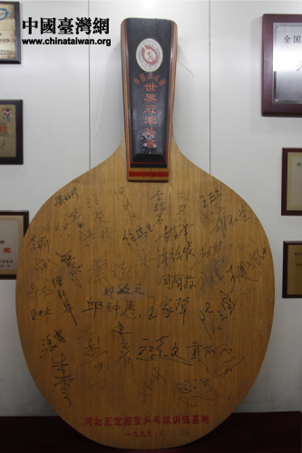 正定國家乒乓球訓練基地內展出寫有鄧亞萍簽名的乒乓球拍。(中國臺灣網 焦源源 攝)