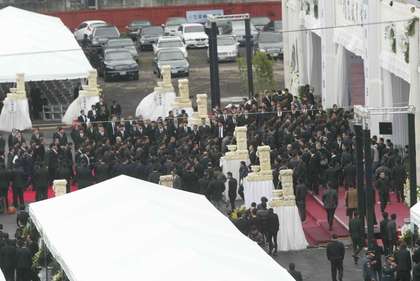 天剛微亮,告別式會場已有不少黑衣人集體進出。(圖片來自臺媒)