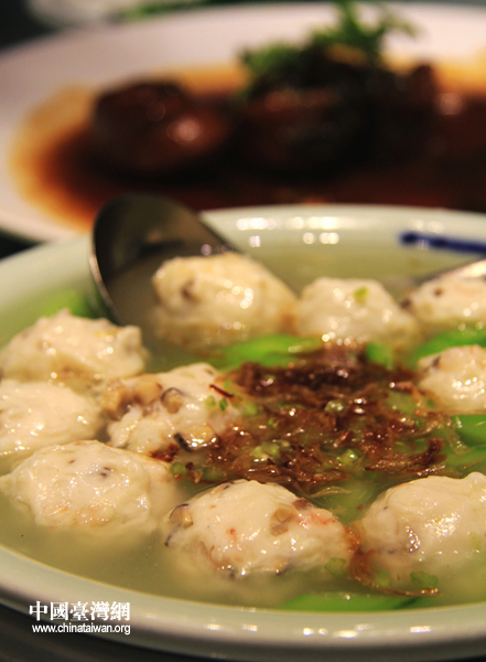 第八道:錦繡海中寶 魚丸是閩臺(tái)一代的特產(chǎn)美食,無(wú)論日常三餐還是擺酒設(shè)宴,都少不了魚丸的影子。這色澤誘人,Q勁十足的魚丸里融合了墨魚、蝦仁、香菇,不僅有魚味,蝦和菌類的鮮美更是讓這道菜亮點(diǎn)十足。