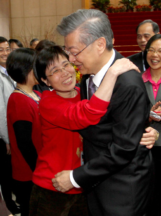 柯長珠一見到陳沖走來,大方在眾人面前獻(xiàn)上“愛的抱抱”,新任臺當(dāng)局“行政院長”江宜樺對柯長珠說“‘院長’就拜托你了”,讓陳沖忍不住紅了眼眶。