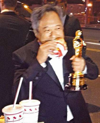 李安路邊一手拿小金人獎杯、一手拿漢堡狼吞虎咽的摸樣被夸可愛。(圖片來自臺媒)