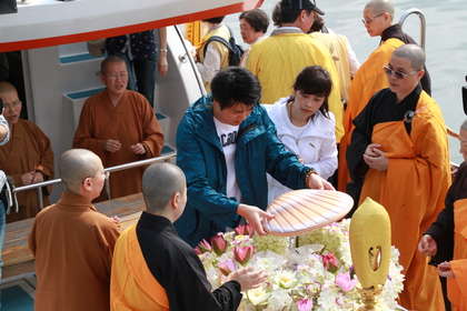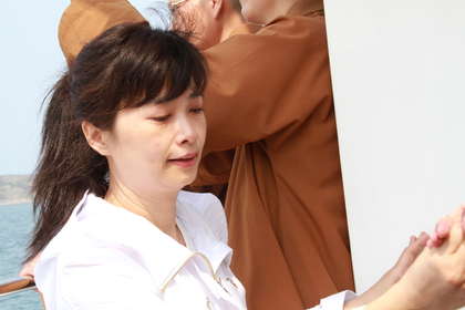 今天上午遺孀王芝祥及26歲的獨子潘惟智,依照潘安邦的生前遺愿,跨海來到已20年沒有踏上的潘安邦澎湖故居細細懷念后,將他的部分骨灰放入紙制的貝殼容器內,再放在蘭花編織成蓮花座造型的載具,在海天佛剎法師誦經祝禱下,包船出海將他的骨灰海葬于西嶼內埯外海,永眠外婆的澎湖灣。(中國臺灣網 王文英)