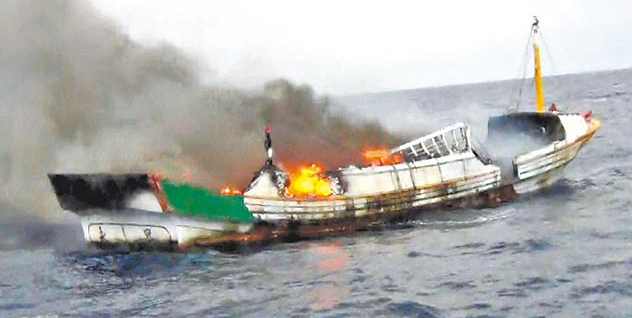 “永升106號”昨日凌晨在離海岸約52海里處,輪機室赫然冒出濃煙與火苗,因柴油儲藏在輪機室,火勢猛烈,船只燒毀、傾斜,全體船員跳海逃生。