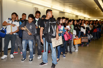 臺灣漁民遭菲律賓公務船射殺,馬英九11日對菲律賓下72小時通牒,菲律賓面臨勞工赴臺受限制裁。圖為12日最新一批搭機抵臺的菲律賓勞工。(圖片來自臺媒)
