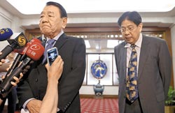 菲律賓總統特使裴瑞茲(左)15日晚間拜會臺當局“外交部”后,面色鐵青地強調自己代表菲律賓總統來向“廣大興28號”事件受害者洪石成的家屬表達深刻歉意。白熙禮(右)則表情凝重陪在一旁。(圖片來自:臺灣《中國時報》)