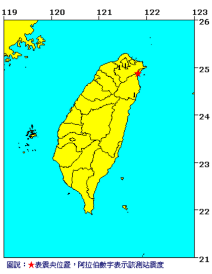 25日下午14時8分,臺灣宜蘭縣頭城鎮發生規模歷史4.0級地震。(圖片來源:臺灣氣象部門網站)