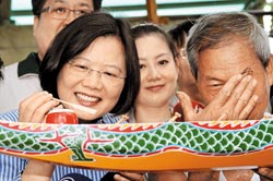 前民進黨主席蔡英文(左)6日拜會龍舟師傅劉清正(右),對檜木做的小小劃槳很感興趣。有關“會計法”修法爭議,她認為是迫在眉睫的價值危機。(來源:臺灣《中國時報》)