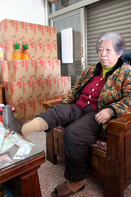 72歲的陳張麗玉17歲時(shí)在金門海邊被地雷炸斷右小腿。她出示右小腿義肢,提醒世人地雷的可怕。(圖片來源:臺(tái)灣“中央社”)