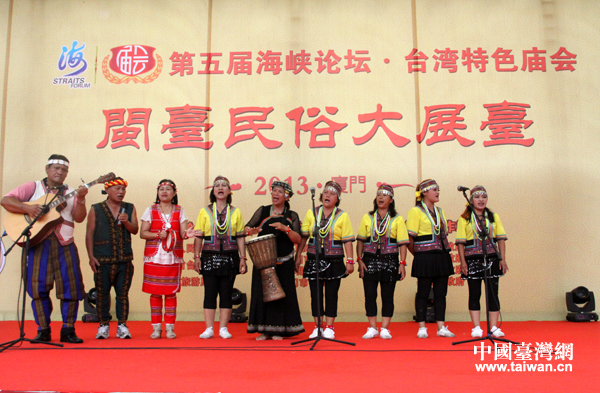 來自閩臺兩地的少數民族為廟會熱場表演。(中國臺灣網 孟雅詩 攝)