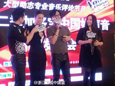 《中國好聲音》第二季公布導師名單,由庾澄慶(左起)、那英、汪峰、張惠妹擔任導師。(圖片來自新浪微博)