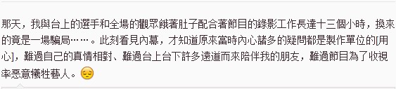 孟庭葦在微博中寫道:那天,我與臺上的選手和全場的觀眾餓著肚子配合著節目的錄影工作長達13個小時,換來的竟是一場騙局……。此刻看見內幕,才知道原來當時內心諸多的疑問都是制作單位的“用心”,難過自己的真情相對、難過臺上臺下許多遠道而來陪伴我的朋友,難過節目為了收視率惡意犧牲藝人。 (圖片取自孟庭葦微博)