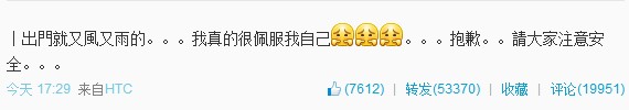正出席《最美和聲》北京海選第三場的蕭敬騰本人,也覺得不可思議,下午在個(gè)人官方微博上留言說,“一出門就又風(fēng)又雨的……我真的很佩服我自己…抱歉…請大家注意安全…”。(蕭敬騰微博截圖)