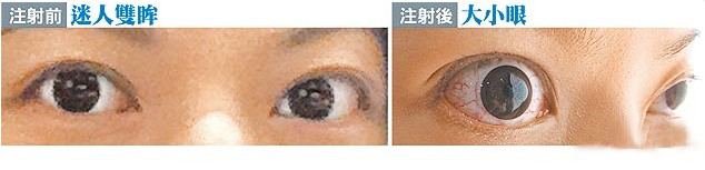 吳太太說,做完療程后她遵從醫(yī)師囑咐,4小時內(nèi)不敢躺下、碰臉,之后洗臉也特別注意不按壓施打處,不料3天后左眼眼皮逐漸下垂,一周后雙眼變成大小眼,臉部肌肉完全放松時,左眼皮下垂到像整片蓋下,若用力撐開雙眼,右眼又睜大得像在瞪人,看起來很怪異,她嚇得趕緊回診求救,醫(yī)師幫她補(bǔ)打一針肉毒桿菌并提供舒緩藥劑眼藥水,但狀況并未改善。
