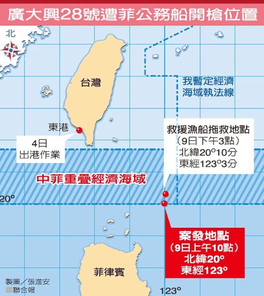 臺灣漁船“廣大興28號”遭菲律賓公務船開槍位置。(圖片來自臺媒)