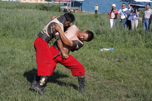 蒙古族的小伙子為臺灣嘉賓表演蒙古式摔跤(中國臺灣網 蕪同 攝)