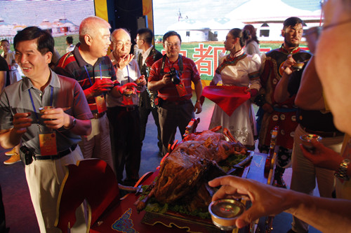 宴會主人為臺灣嘉賓奉上蒙古族的最高歡迎禮:烤全羊(中國臺灣網 蕪同 攝)