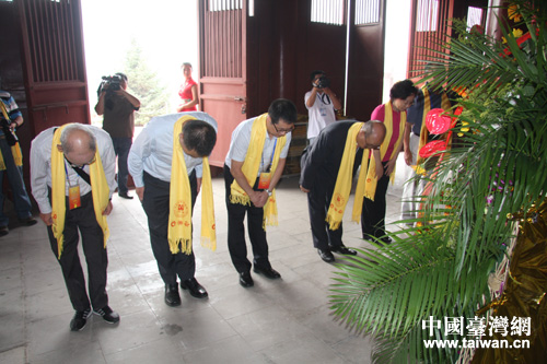 臺灣參訪團團長嚴雋泰、中華文化聯誼會副秘書長李保宗代表全體人員敬獻花籃(中國臺灣網 蕪同 攝)