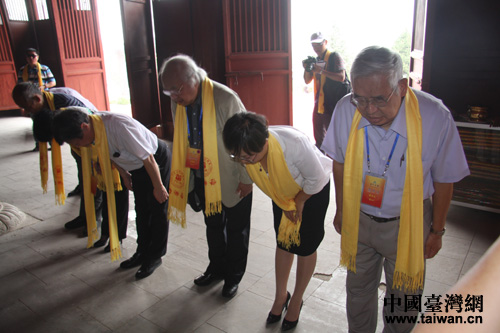 曾子后人、臺灣世新大學講座教授曾永義特為本次祭祖撰寫了祭文并敬獻花籃(中國臺灣網 蕪同 攝)