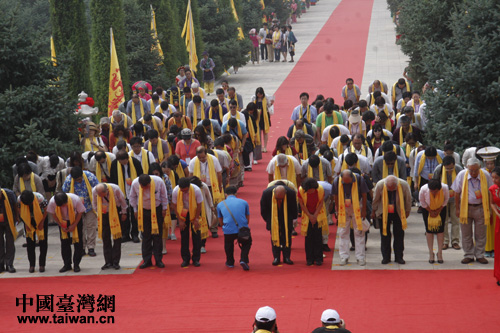 全體人員在黃帝城祭拜中華三祖后,向中華三祖三鞠躬(中國臺灣網 蕪同 攝)