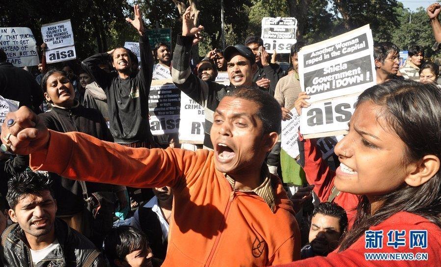 2012年12月19日,印度新德里,印度人民黨的女成員游行譴責(zé)女生在公交車上被輪奸的事件。2012年12月16日晚一名23歲的醫(yī)學(xué)女生在德里南部與其男性朋友一起乘公交時(shí),車上包括司機(jī)在內(nèi)的7名男子對(duì)兩人進(jìn)行毆打,并輪奸了女生,之后將二人扔出公交車逃逸。圖片來源:新華網(wǎng)