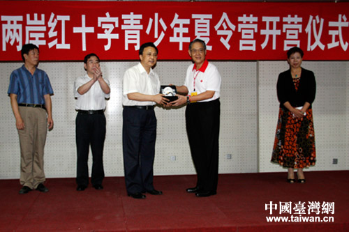 中國(guó)紅十字會(huì)副會(huì)長(zhǎng)郭長(zhǎng)江(左三)和臺(tái)灣紅十字組織理事趙天星(左四)互送禮物。(中國(guó)臺(tái)灣網(wǎng) 郜利敏 攝)