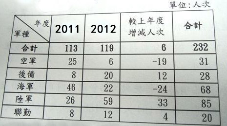 2010年至2012年,臺軍因酒駕違紀案件520人次,其中志愿役399人次。若以軍種區分,臺陸軍221人次、海軍98人次、空軍87人次,“憲兵”、后勤酒駕案件則相對較少。