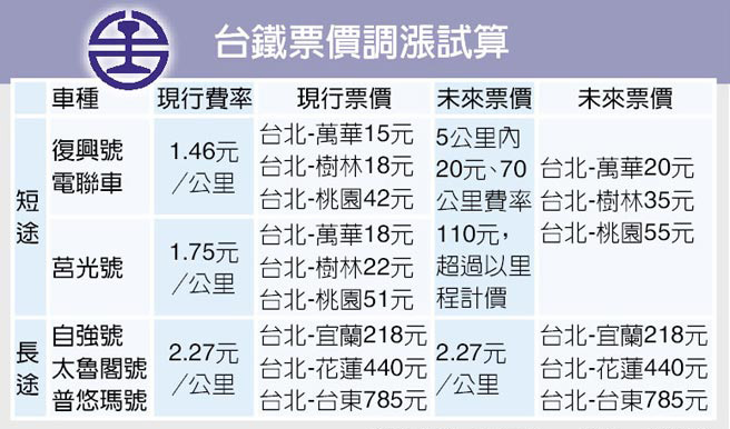 臺鐵目前票價為1995年制定,當時依成本及載客狀況,設定基本費率為每人每公里1.01元,再根據列車等級,計算出自強號每公里2.27元、莒光號1.75元、復興號及電聯車1.46元的費率,依照行駛里程計算票價,最低票價為15元。