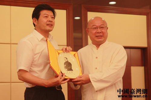 宋慶齡基金會常務副主席齊鳴秋向臺灣代表贈送禮物。(中國臺灣網 雍紫薇 攝)