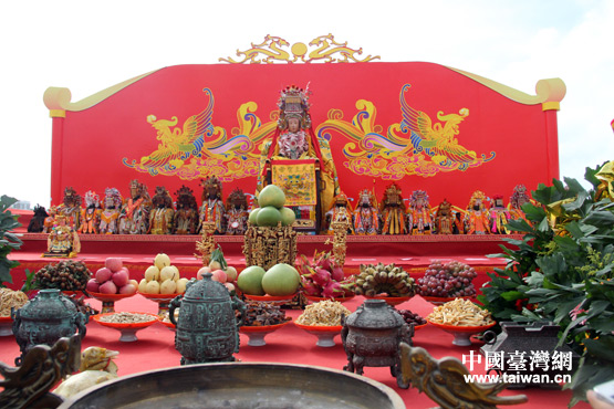 8月1日上午,2013兩岸媽祖佑南疆祈福祭典儀式在海南潭門港舉行。圖為擺放在祭祀臺上的兩岸媽祖像。(中國臺灣網(wǎng) 李丹 攝)
