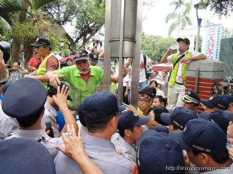 該社團(tuán)會員過于激動,又推又拉竟把臺灣“立法院”大門圍墻上的鐵欄桿推倒,企圖沖入,與警方發(fā)生推擠。
