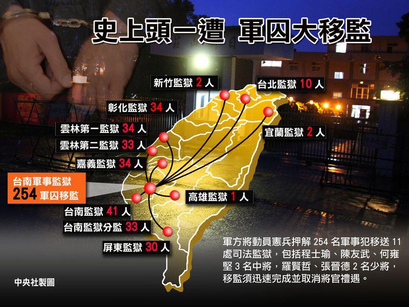 臺南軍事監獄的254名軍犯,今天同步移監到南、北11處監所,包括宜蘭監獄2人、屏東監獄30人、高雄監獄1人、嘉義監獄34人、云林第一監獄34人、云林第二監獄33人、新竹監獄2人、彰化監獄34人、臺北監獄10人、臺南監獄41人、臺南監獄臺南分監33人等。