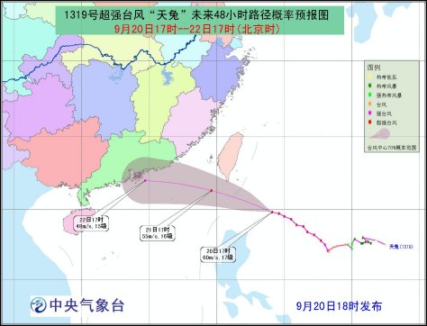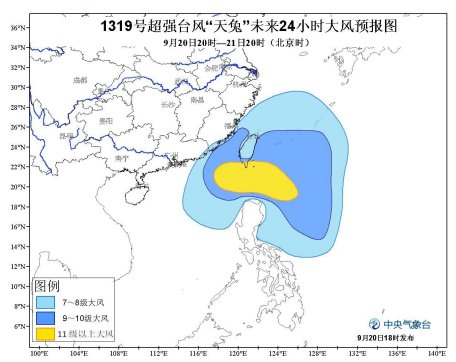 中央氣象臺網站臺風橙色預警指出,“天兔”將以每小時20公里左右的速度向西偏北方向移動,強度變化不大或略有減弱,21日中午前后穿過巴士海峽后,進入南海東北部海面,然后逐漸向廣東沿?拷。