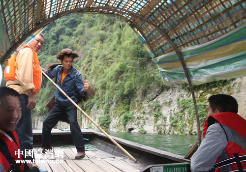 小小三峽上,臺(tái)灣記者表演艄公姿勢(shì)。(中國(guó)臺(tái)灣網(wǎng) 段雯婷 攝)