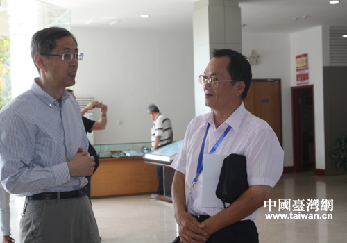 臺灣新聞傳播協(xié)會、高雄市新聞傳播職業(yè)工會理事長,民眾日報記者盧鴻霖向三峽工程工作人員了解大壩情況。(中國臺灣網(wǎng) 段雯婷 攝)