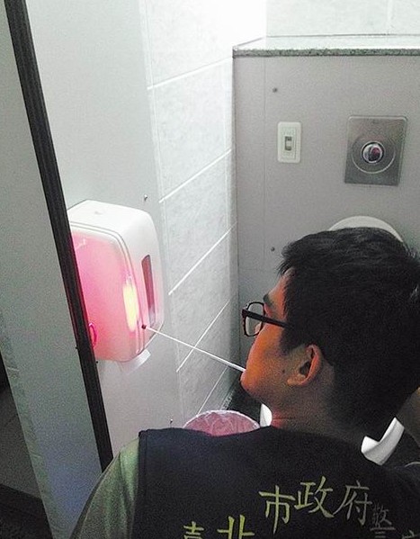 警方鑒識人員持儀器,在該大樓女廁察看有無遭裝偷拍器材。(圖片來自臺媒)