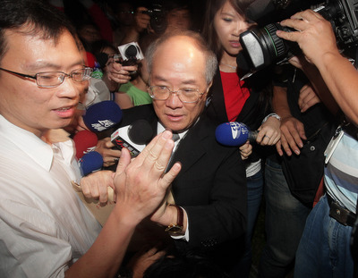 臺北地檢署偵辦檢察總長黃世銘泄密案,3日以被告身份傳喚黃世銘(前右)到案。黃世銘晚間表示,對得起總長這個職務。(圖片來自臺媒)