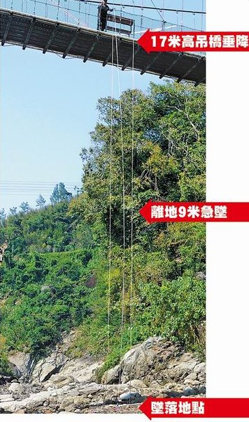 出事的苗栗縣騰龍吊橋高17米,女學(xué)生垂降到一半時,因繩索扣環(huán)松脫摔死。(臺媒圖)
