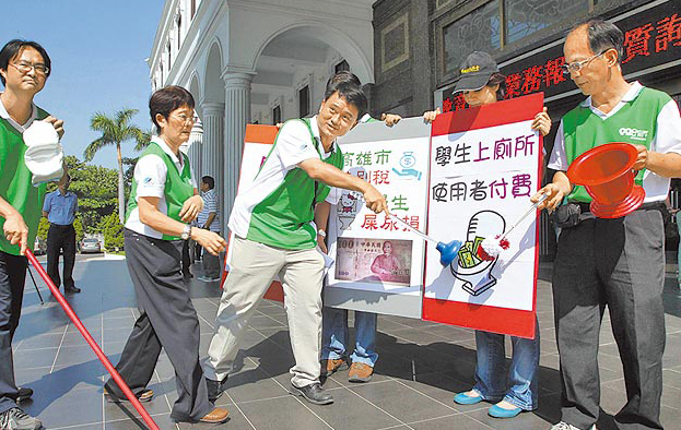 高雄市教育產業工會昨上午到市議會向教育局陳情,并攜帶尿桶、刷子和尿布,演出行動劇,嘲諷學生若不繳廁所清潔費,只能減少上廁所頻度或自行清潔整理。