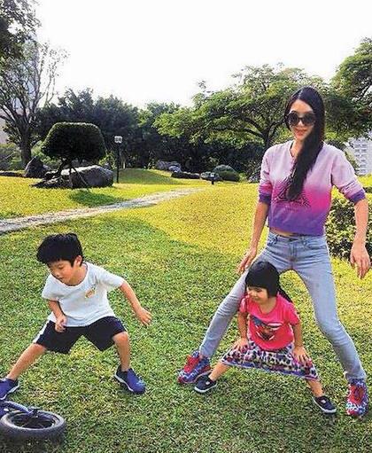 曹格的妻子吳速玲(右)昨帶著兒女在中部親戚家附近踏青散心。(臺媒圖)
