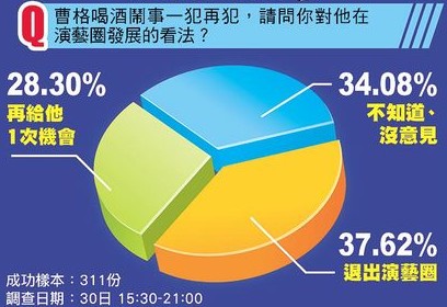 臺媒昨針對“曹格喝酒鬧事一犯再犯,請問你對他在演藝圈發(fā)展的看法?”進行民調(diào),311份樣本中,37.62%民眾認為他應退出演藝圈,28.3%民眾認為應再給他1次機會,34.08%民眾則表示不知道、沒意見。(中國臺灣網(wǎng) 高旭)