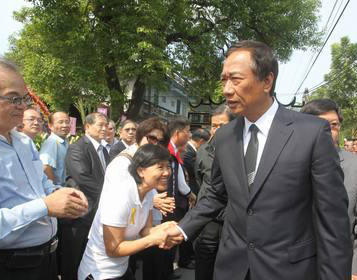 鴻海集團董事長郭臺銘(右一)也出席告別式,離去時不少民眾上前與他握手。(圖片來自臺媒)
