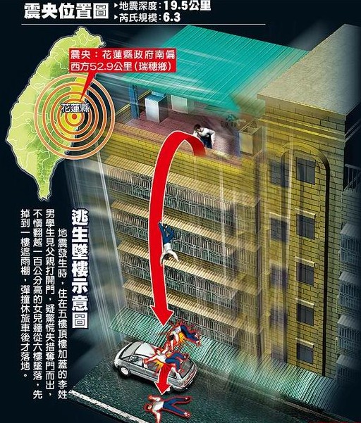 地震發生時,住在五樓頂樓加蓋的李姓男學生見父親打開門,疑驚慌失措奪門而出,不慎翻越一百公分高的女兒墻從六樓墜落,先掉到一樓遮雨棚,彈撞休旅車后才落地。