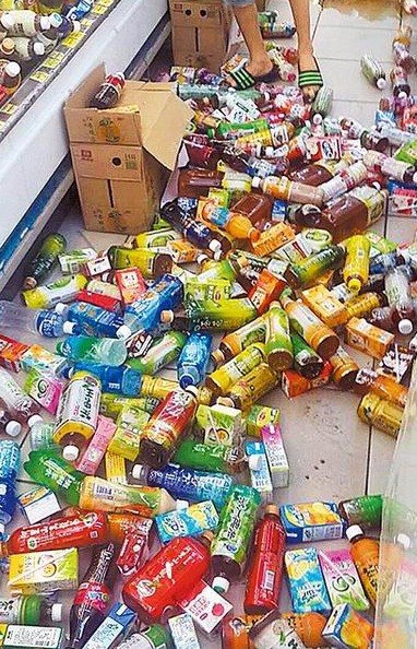 昨地震發生后,花蓮鳳林鎮超市內的飲料掉滿地。(臺媒圖)