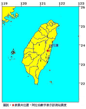 地震示意圖。圖中紅五角心表示震中位置,數(shù)字表示震度規(guī)模。(圖片取自臺(tái)媒)