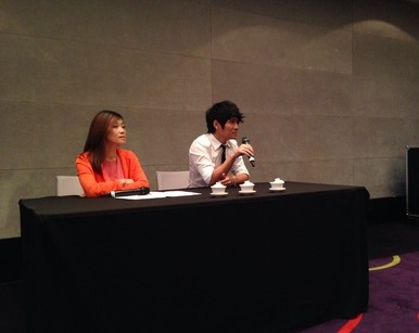 曹格(右)在經紀人陪同開記者會,宣布戒酒。(臺媒圖)